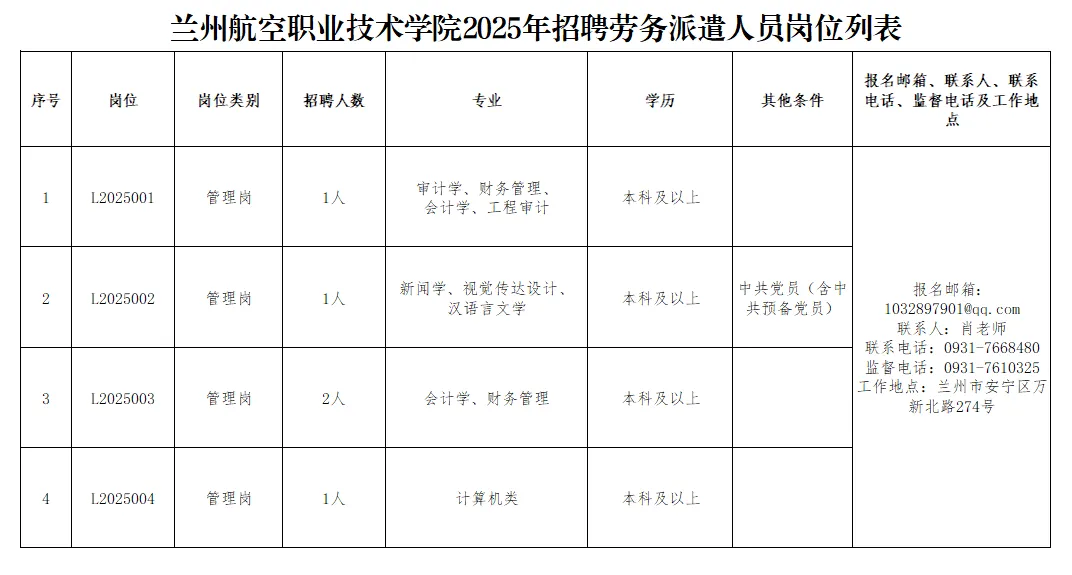附件1:兰州航空职业技术学院2025年招聘劳务派遣人员岗位列表.xlsx