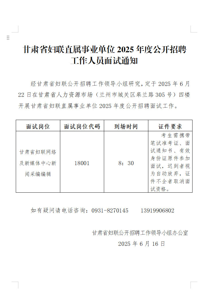 2025年甘肃省妇联直属事业单位招聘工作人员面试通知