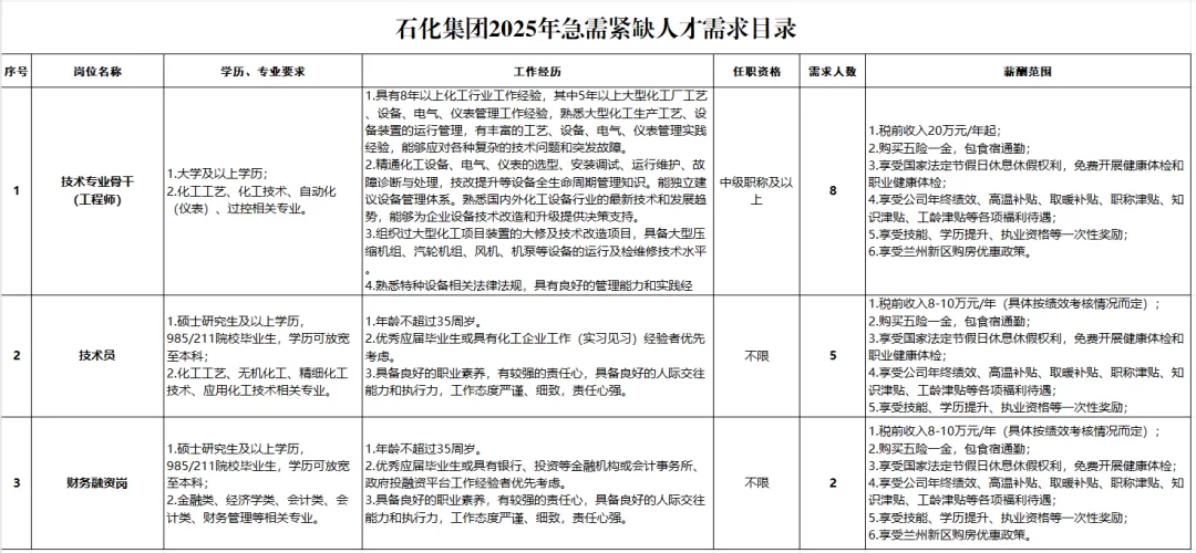 (三)应聘人员除具备以上基本条件外,还需满足招聘岗位所要求的其他资格条件(详见《石化集团2025年急需紧缺人才需求目录》(附件1))