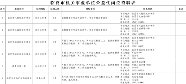 为促进就业困难人员就业,充分发挥公益性岗位托底安置作用,根据州人社局、州财政局《关于印发临夏州公益性岗位开发管理工作实施细则的通知》(临州人社通〔2020〕105号)等有关文件规定及工作需要,现面向社会公开招聘城镇公益性岗位人员。