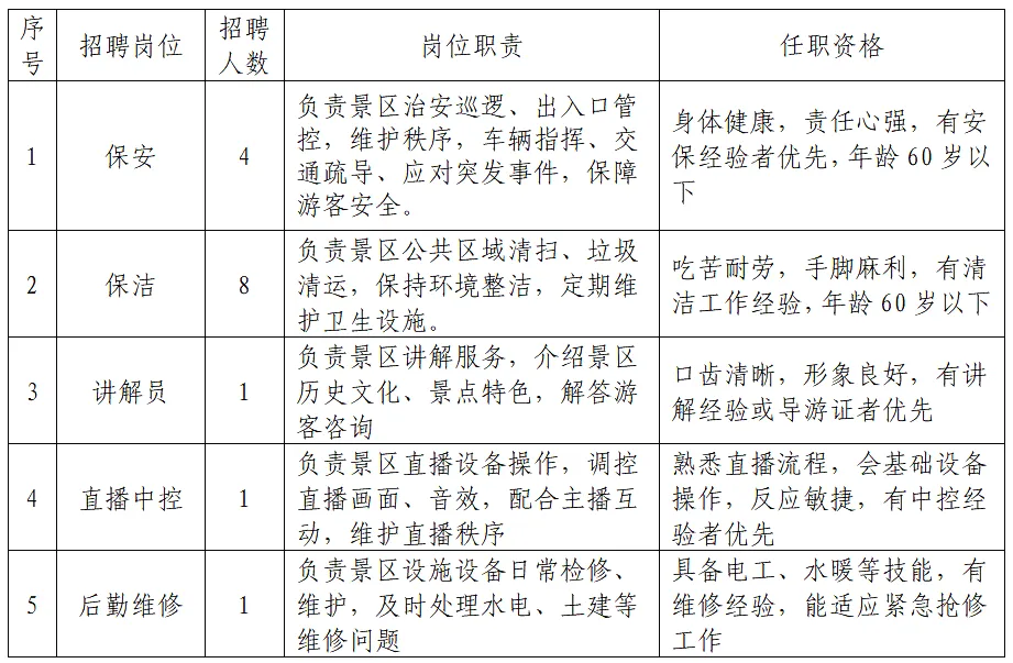 用工形式:劳务派遣临时性用工,共计3个月(具体时间根据景区实际闭园时间灵活调整)。