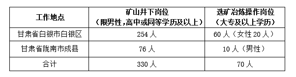 根据岗位空缺实际,决定面向社会公开招聘技能操作人员400人,其中,男性380人,女性20人。主要从事矿山(井下)、选矿、冶炼、维修等技能操作岗位,具体工作地点、岗位分布、学历要求、需求人数如下: