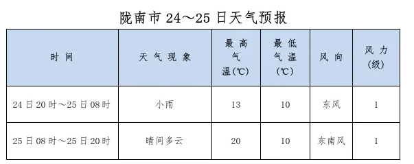 (二)请考生随时关注气象部门的天气预报,合理选择出行路线和出行方式,做好时间安排,注意交通安全,确保顺利参加考试。根据*** 新资料分析,考试期间(10月24~25日)天气预报:24日陇南市小雨,*** 低气温10℃左右,*** 高气温13℃左右,25日多云,*** 低气温10℃左右,*** 高气温20℃左右。具体预报见下表: