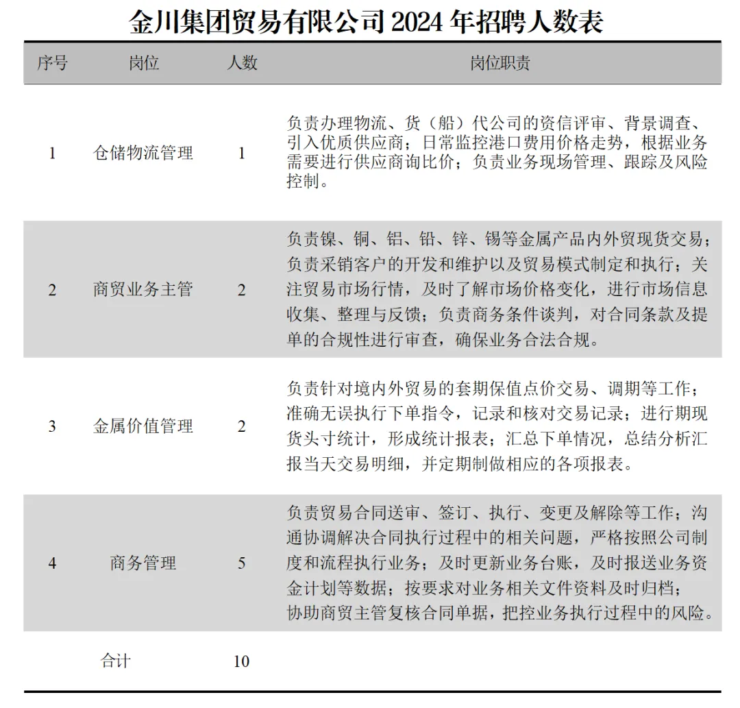 3.专业:商贸业务主管、商务管理岗位经济、金融、国际贸易、冶金化工、材料工程类专业优先;仓储物流管理岗位仓储物流管理、供应链管理等专业优先;金属价值管理岗位经济学、数学、金融学、国际贸易、冶金工程、材料工程类专业优先;