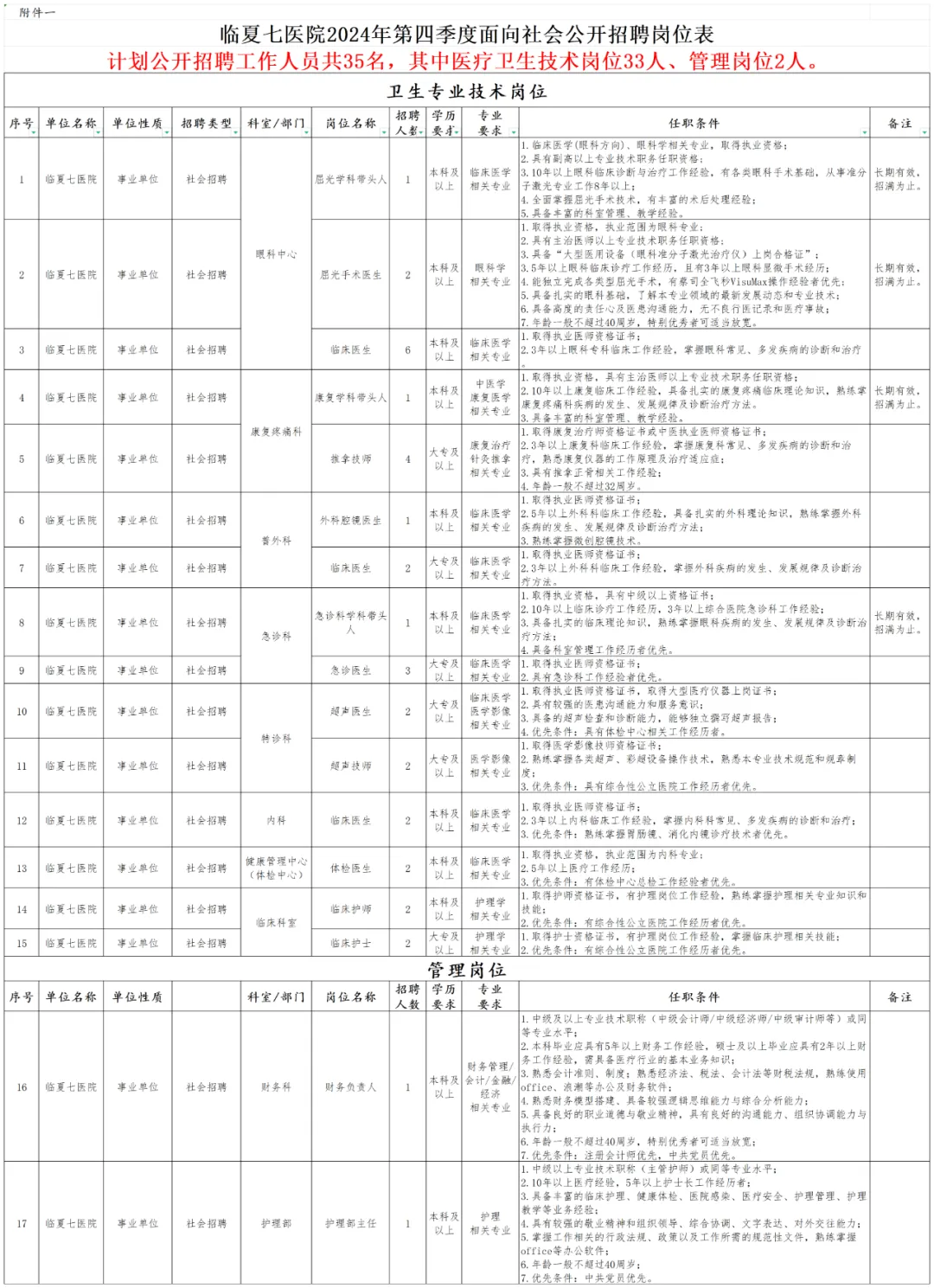 1.《临夏七医院2024年第四季度面向社会公开招聘岗位表》