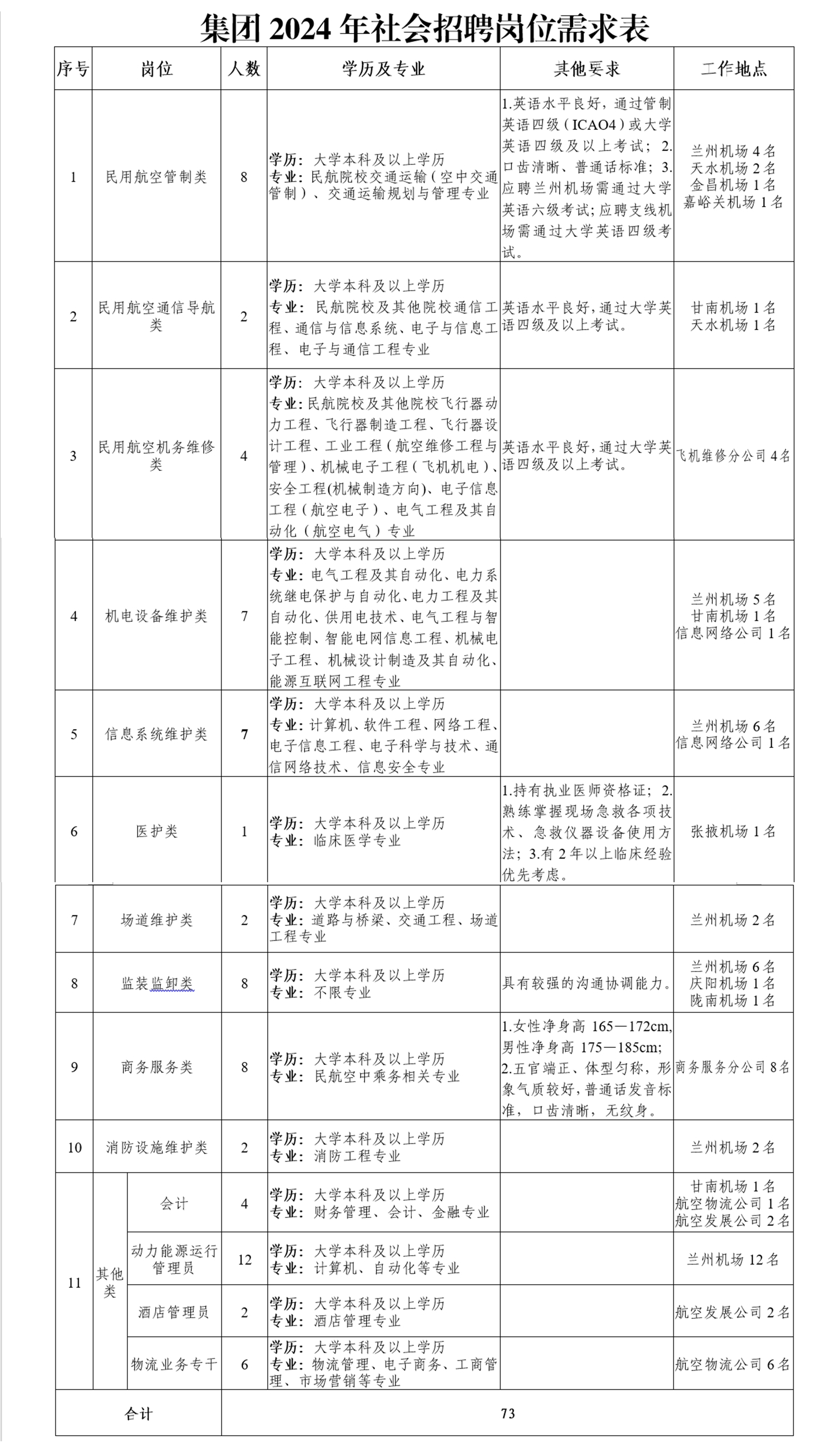 不限专业,具有较强的沟通协调能力。(兰州机场6名、庆阳机场1名、陇南机场1名)