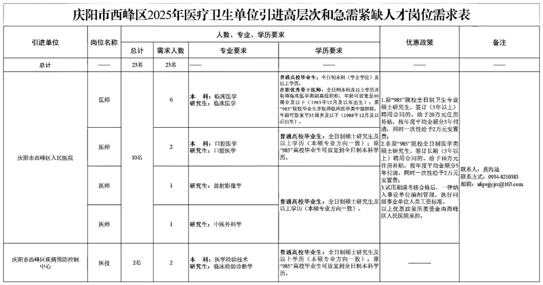 1.庆阳市西峰区2025年医疗卫生单位引进高层次和急需紧缺人才岗位需求表.xls