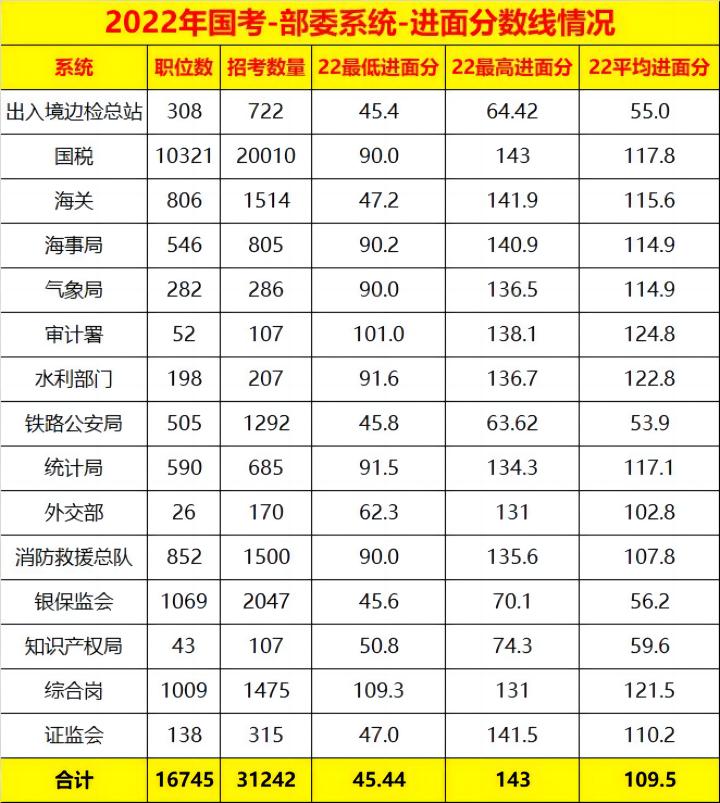 在2022年国考一共招录31242人,其中单单国税部门就招录了20000人以上,并且国税系统也是每年报名阶段***受考生青睐的系统,众所周知2022年国考*** 高进面分数为143分,是出自国税系统。并且近三年国考*** 高分都是出自于国税系统,可以看到国税系统每年竞争是多么的激烈。2022年国考*** 高分其次是141.9分来自于海关系统,然后是证监会141.5分和西藏阿里岗位进面分数相同。