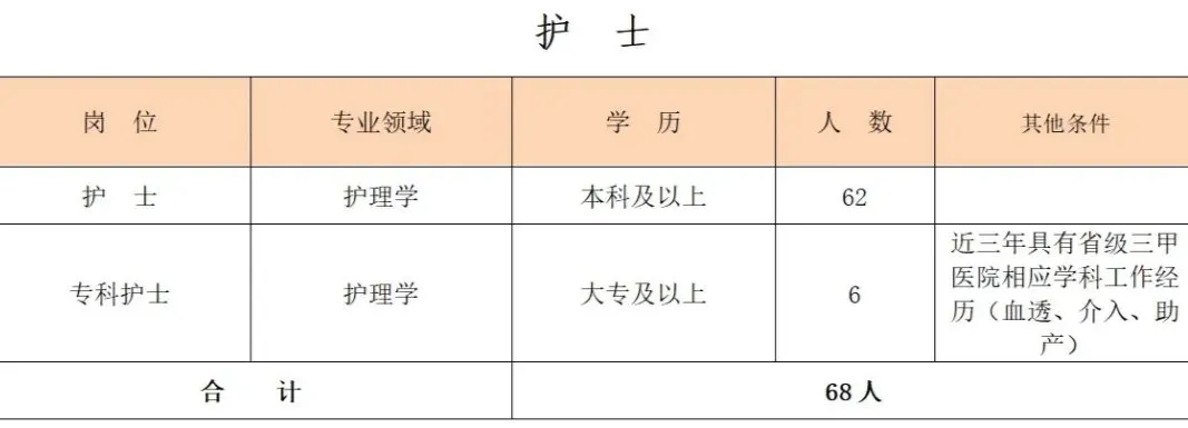 (2)专科护士:近三年具有省级三甲医院相应学科工作经历(血透、介入、助产);全日制本科及以上学历者优先考虑。