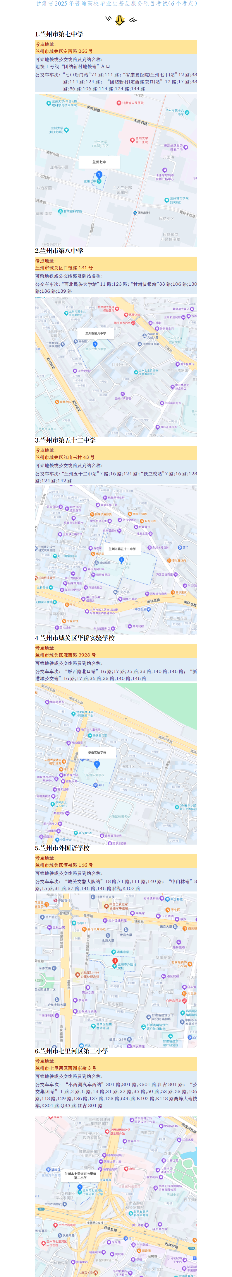 二、考场安排指引。兰州市第七中学考点为支医和“三支一扶”其他岗位;兰州市第八中学、兰州市第五十二中学、兰州市城关区华侨实验学校、兰州市外国语学校均为“三支一扶”其他岗位;兰州市七里河区第二小学为特岗教师。