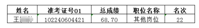 因报考其他岗位进入资格初审考生1人放弃,在指标范围内按照成绩从高到低的顺序予以递补1人: