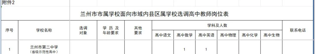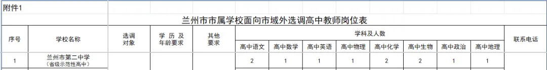 根据《兰州市市属学校公开选调高中教师公告》,兰州市第二中学本次面向市域外及市域内县区属学校选调高中教师共8个学科13人,其中,高中语文、数学、英语、化学、生物学科各2人,高中物理、政治、地理学科各1人,具体岗位详见: