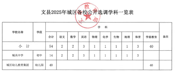 城区学校选调教师54人,其中:初中教师14人、幼儿园教师40人。各学段选调学科岗位及名额如下: