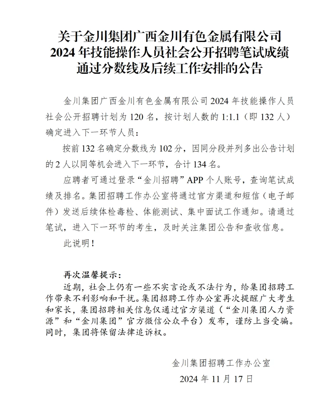 2024年金川集团广西金川有色金属有限公司技能操作人员社会公开招聘笔试成绩通过分数线及后续工作安排公告