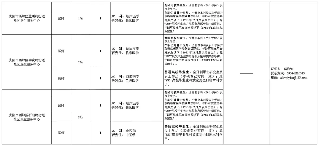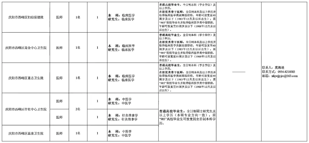 全日制本科生年龄为26周岁及以下(1997年12月及以后出生)、硕士研究生年龄为29周岁及以下(1994年12月及以后出生);取得临床医学类副高级职称的可放宽至40周岁及以下(1983年12月及以后出生);原“985”院校毕业生取得临床医学类中级职称可放宽至35周岁及以下(1988年12月及以后出生)。具体专业学历要求详见《庆阳市西峰区2025年医疗卫生单位引进高层次和急需紧缺人才岗位需求表》(附件1)。