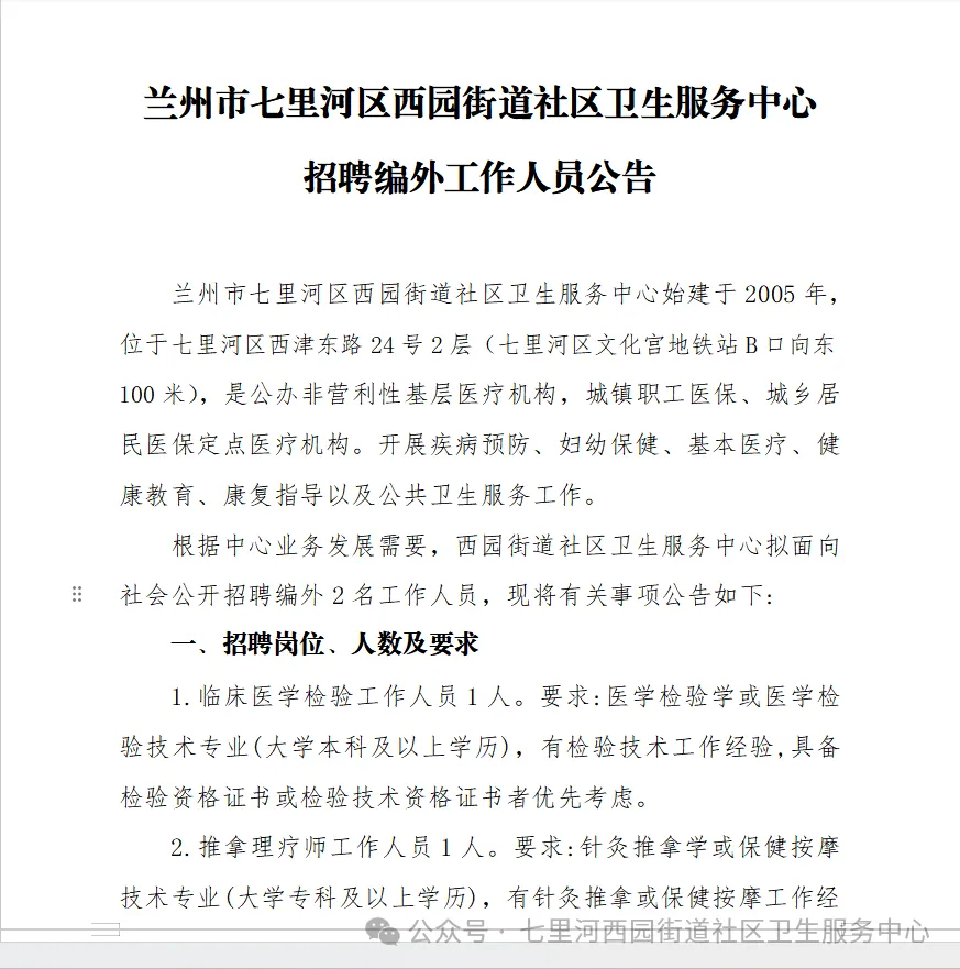 2054年甘肃兰州市七里河区西园街道社区卫生服务中心招聘编外工作人员公告
